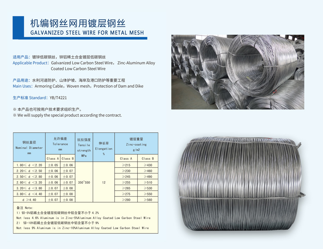 通信光電纜用鍍鋅鋼絲通信光電纜用鍍鋅鋼絞線(xiàn)機(jī)編鋼絲網(wǎng)用鍍層鋼絲防振錘用鋼絞線(xiàn)一般用途鍍鋅及鍍鋅鋁合金鍍層鋼絲及鋼絞線(xiàn)預(yù)絞式金具用鍍層鋼絲制釘用鍍層鋼絲